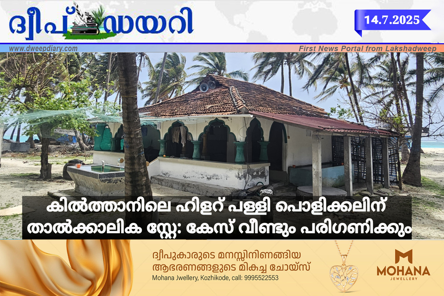 എറണാകുളം: കിൽത്താൻ ദ്വീപിലെ ഹിളറ് പള്ളി പൊളിക്കൽ നടപടിയുമായി ബന്ധപ്പെട്ട് ഹൈക്കോടതി ഇടപെട്ടു. പള്ളി പൊളിക്കാനുള്ള അധികൃതരുടെ 2025 ജൂലൈ 4-ാം തീയതിയിലുള്ള ഉത്തരവ് ഹൈക്കോടതി താൽക്കാലികമായി സ്റ്റേ ചെയ്തു.