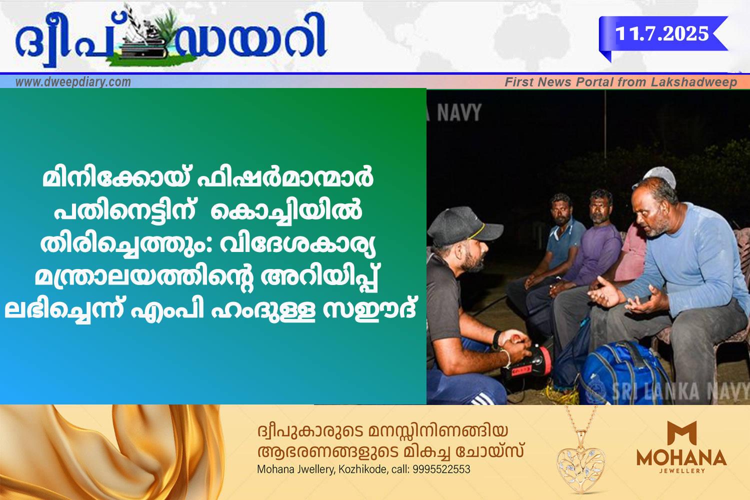 മിനിക്കോയി ദ്വീപിൽ നിന്ന് ജൂൺ ഇരുപത്തി അഞ്ചിന് മത്സ്യബന്ധനത്തിന് പോയ ഗാലക്സി എന്ന ചെറു ബോട്ട് പിന്നീട് കാണാതാവുകയും ജൂലായ് ആറിന് കൊളംബോയിൽ ശ്രീലങ്കൻ നേവിയുടെ തിരച്ചിലിൽ സുരക്ഷിതരായി രക്ഷപ്പെടുത്തുകയും ചെയ്തതിനെ തുടർന്ന് ഔദ്യോഗിക നടപടിക്രമങ്ങൾക്ക് ശേഷം നാല് ഫിഷർമാന്മാരും ജൂലായ് 18 ന് കൊളംബോയിൽ നിന്നും രണ്ട് വിമാനങ്ങളിലായി കൊച്ചിയിൽ എത്തിച്ചേരുമെന്ന് കേന്ദ്ര വിദേശകാര്യ മന്ത്രാലയത്തിൽ നിന്നും അറിയിപ്പ് ലഭിച്ചതായി ലക്ഷദ്വീപ് എംപി അഡ്വ.ഹംദുള്ള സഈദ് അറിയിച്ചു.