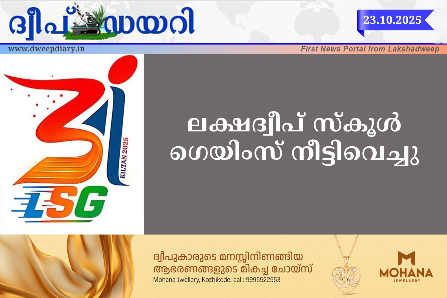 കിൽത്താൻ: ഒക്ടോബർ 24-ന് കിൽത്താനിൽ ആരംഭിക്കാനിരുന്ന ലക്ഷദ്വീപ് സ്കൂൾ ഗെയിംസ് (LSG) 2025 നീട്ടിവെച്ചതായി സംഘാടക സമിതി അറിയിച്ചു. കായിക-യുവജനകാര്യ വകുപ്പിന്റെ നിർദ്ദേശപ്രകാരമാണ് മത്സരങ്ങൾ മാറ്റിവെച്ചത്.